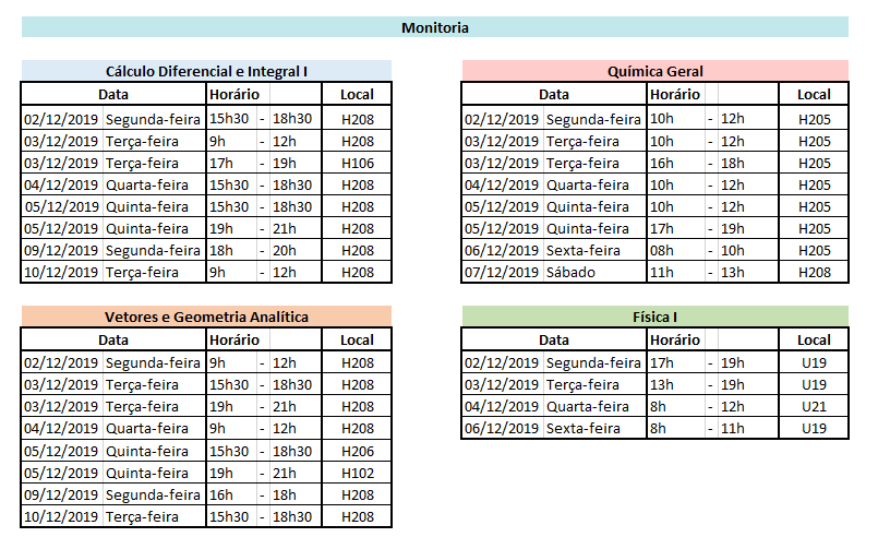 De 02 a 10 de dezembro, serão oferecidas atividades de apoio às provas substitutivas aos alunos do 1.° ano de Engenharia para as disciplinas: