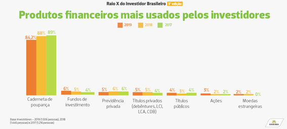 A poupança se mantém como o produto preferido dos investidores, mas vem perdendo participação: 84% deixaram os recursos na caderneta em 2019, enquanto 88% optaram pelo produto em 2018, uma queda de quatro pontos.