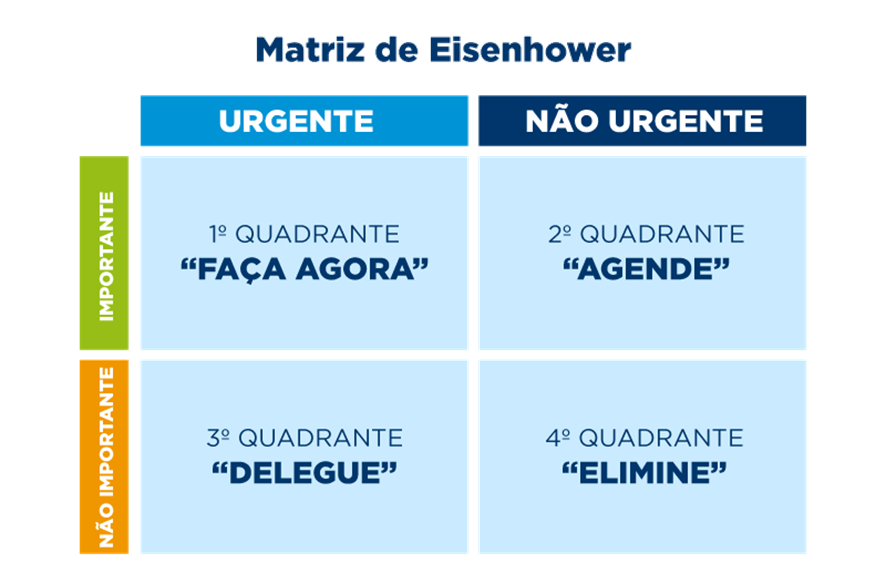 Dica: para determinar o que é importante e o que é urgente, bem como a ordem de execução das atividades, considere aprender mais sobre a Matriz de Eisenhower, desenvolvido pelo ex-presidente norte-americano Dwight Eisenhower, onde identificamos que atividades importantes contribuem para objetivos de longo prazo e nos coloca em um modo proativo, enquanto as atividades urgentes exigem atenção imediata, mas nos coloca em um modo reativo, que nos mantém na defensiva e preocupados: