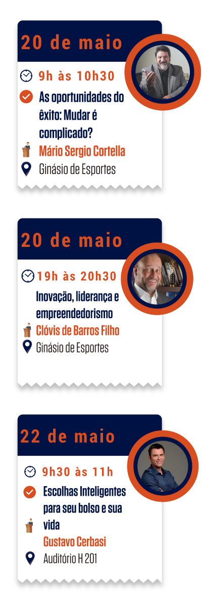 A SMILE 2019 contará com a presença de palestrantes de alto impacto, como Mário Sergio Cortella, Clóvis de Barros Filho, Gustavo Cerbasi e muito mais! Não perca essa oportunidade, essas palestras são gratuitas e abertas ao público.