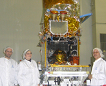 Projeto Aditivo da Missão CoRot – Professor Vanderlei Cunha Parro (à esquerda) com o satélite CoRot durante visita ao laboratório da Alcatel Sapce na França
