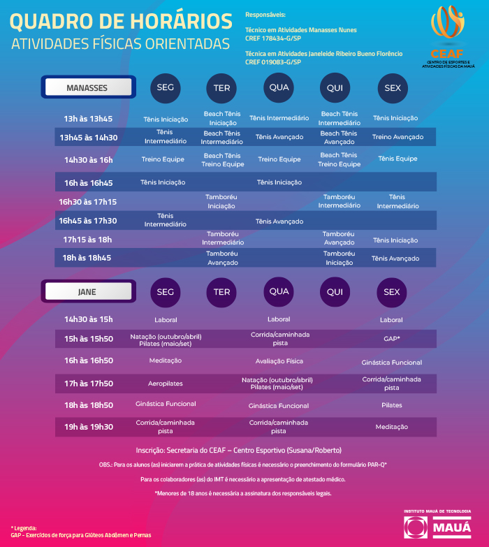 Neste ano, o Centro de Esportes e Atividades Físicas (CEAF) do Instituto Mauá de Tecnologia (IMT) retornará com suas aulas de atividades e programação atualizada. A partir de 6 de março, os alunos, professores e colaboradores do instituto poderão inscrever-se diretamente na secretaria do CEAF, ou ligar para reservar sua vaga e aproveitar as novidades.