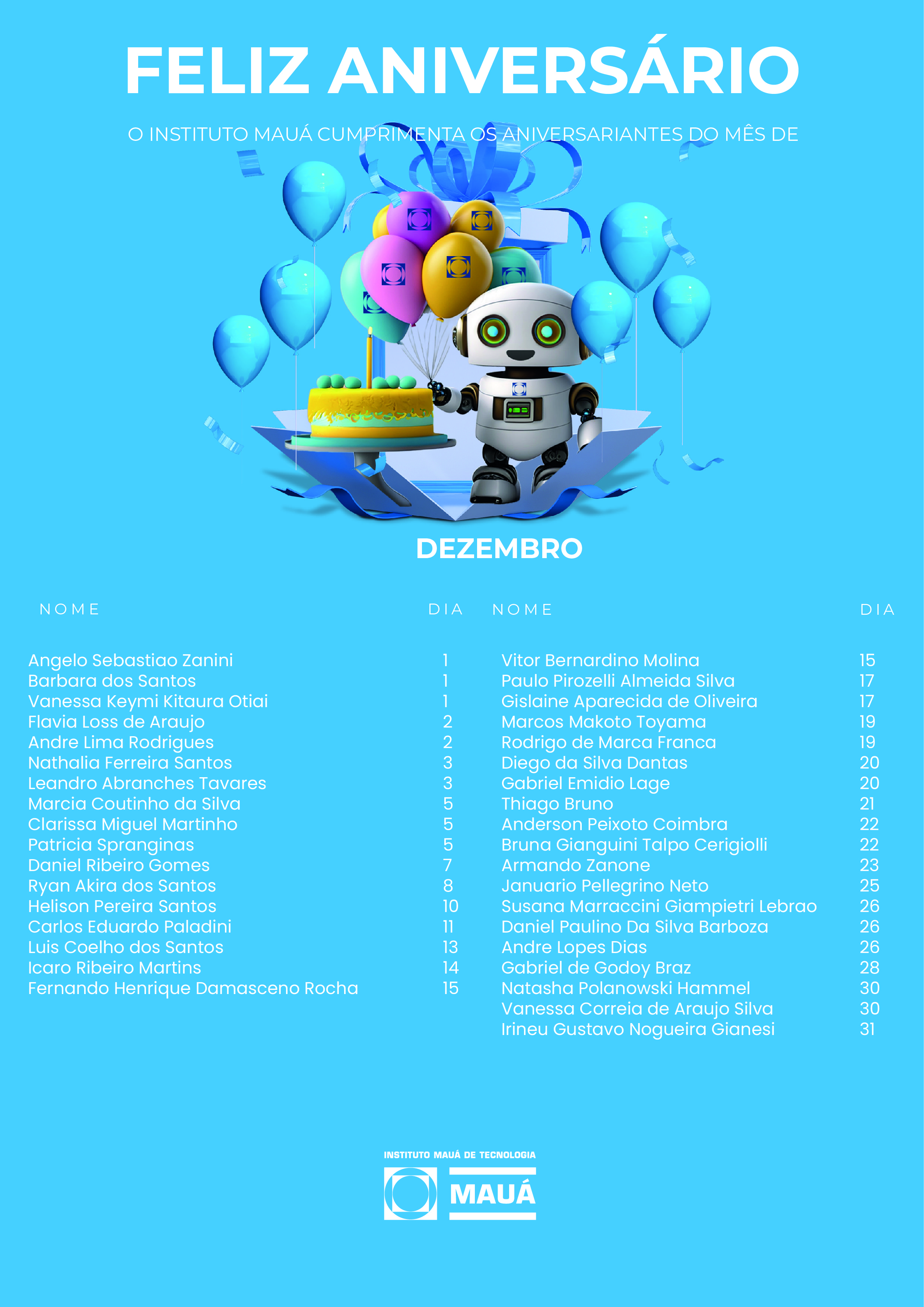 À medida que caminhamos para o encerramento de mais um ano, o Instituto Mauá de Tecnologia (IMT) já se organiza para promover as comemorações de fechamento de 2024. Neste ano, os colaboradores poderão aproveitar uma grande festa de confraternização, agendada para 20 de dezembro, das 13 h às 17 h, no campus do IMT.
