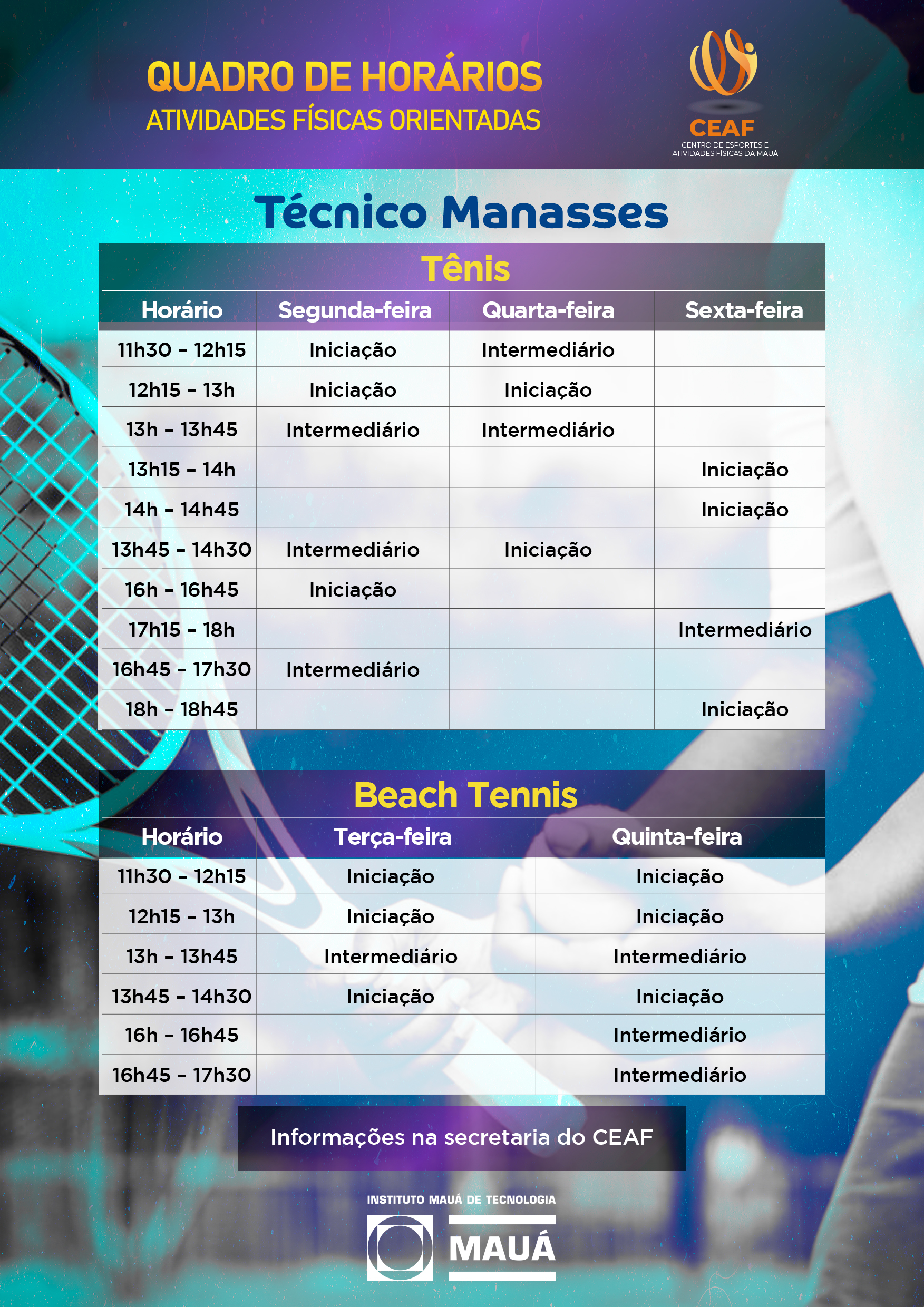 Entre as opções, estão: Atividades de Raquete - Tênis e Beach Tennis, com o técnico Manassés Silva, assim como as Atividades Orientadas - AeroPilates, Alongamento, Caminhada e Corrida, Ginástica Funcional e Pilates, com a técnica Jane Bueno.