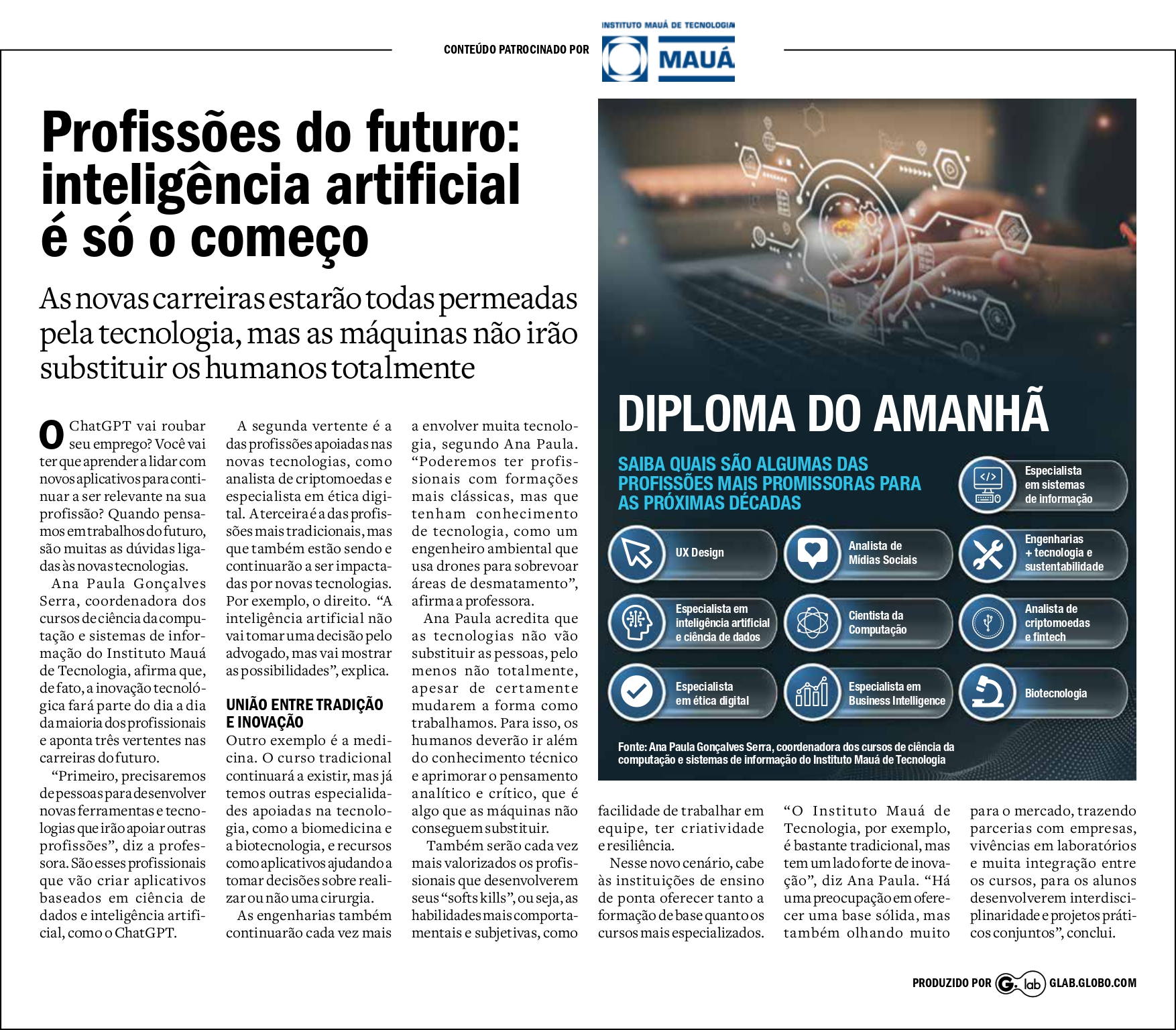 Notícias Na Mídia Profissões do Futuro: inteligência artificial é só o começo Profissões do Futuro: inteligência artificial é só o começo Publicado em: 15/05/2023 Blog Mauá em Foco Artigos Mauá na Mídia